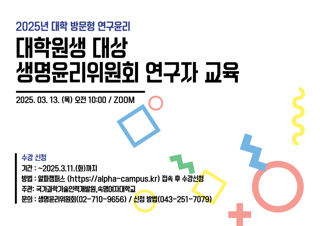 [교육] 2025학년도 IRB 연구자 교육 개최 안내 (3/13 목, zoom)