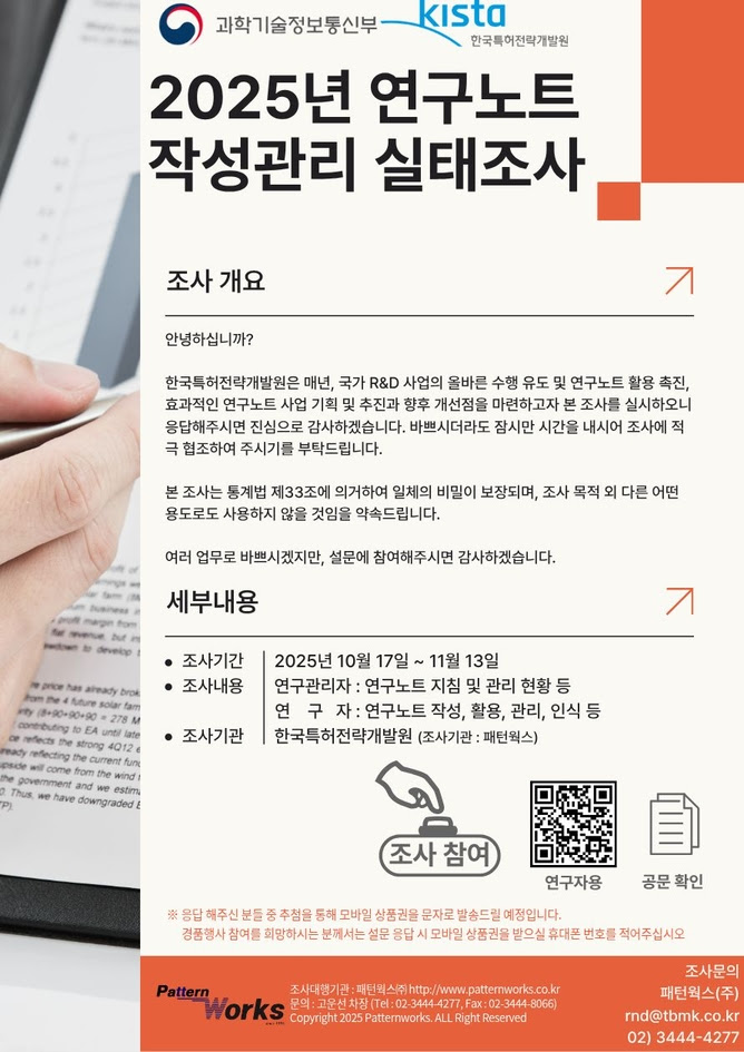 [한국특허전략개발원] 2025년 연구노트 작성관리 실태조사 연구자 참여 안내