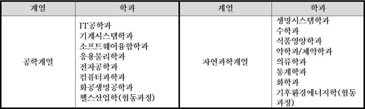 ■ 신청대상: 매월 월별 지급총액(학생인건비, 학술용역,민간R&D 등, BK장학금 등)이 기준금액 미만인 학생연구자의 아래 학과 소속 정년 전임교원