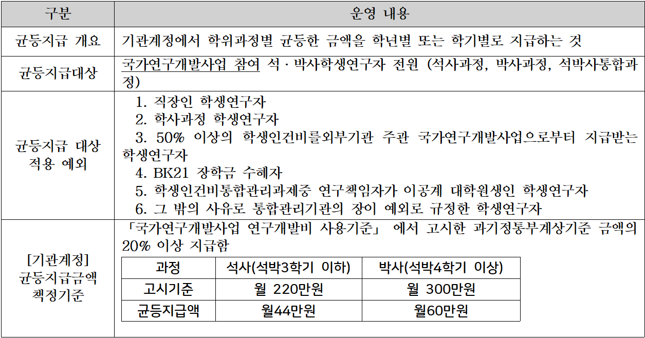 ■ 개요: 연구·학업 전념을 위한 이공계 대학원생 최소한의 생활보장을 위해 이공계 대학원생에게 매월 기준금액(석사 80만원, 박사 110만원)이상 지급 보장하기 위한 재정지원사업