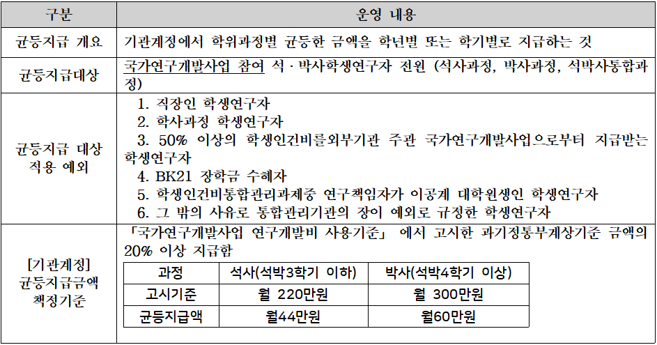 ■ 운영방법: (대여-상환) 이공계 대학원생 지도교수는 기존 연구과제에서 지급하는 학생인건비와 연계하여 학생인건비 부족분에 대해 사업비를 대여하여 지급하고 추후 연구비 수주를 통해 지원금을 상환함 (단, 균등지급대상* 학생연구자의 경우, 균등지급액분은 기관계정에서 지원함)