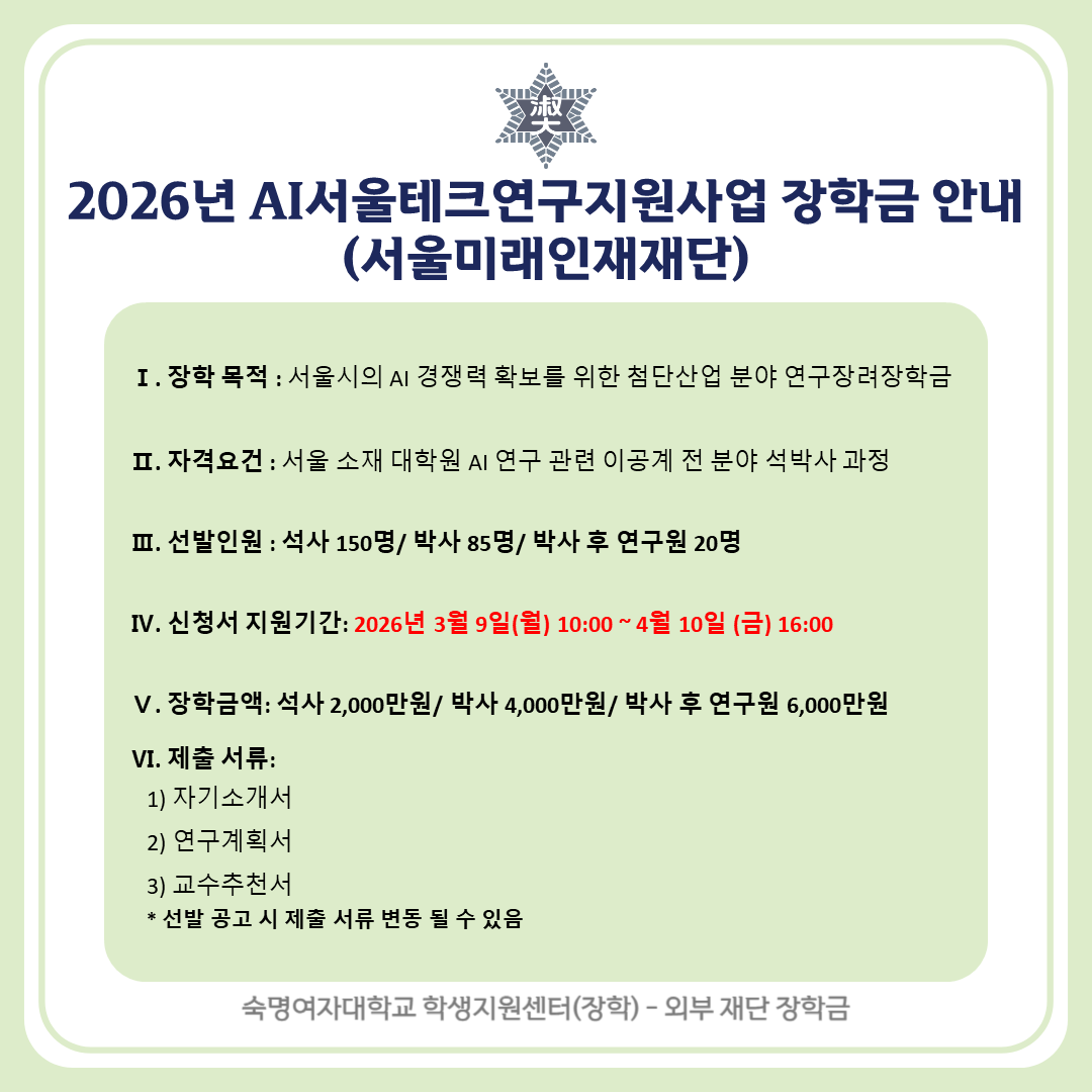 [공지] [장학] 서울미래인재재단 2026년 AI서울테크연구지원사업 장학금 안내